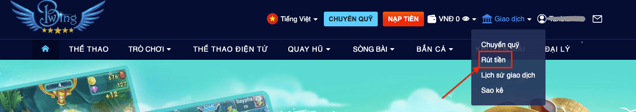 Bước 1: Sau khi đăng nhập vào website của Bwing. Nhấp vào “GIAO DỊCH” và chọn “Rút tiền”