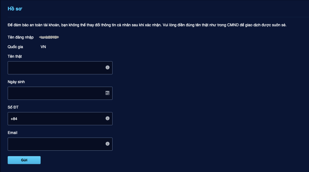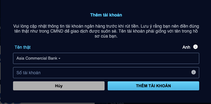 • Tên thật trong Hồ sơ, tên tài khoản ngân hàng, và tên trong CCCD của bạn phải giống nhau.