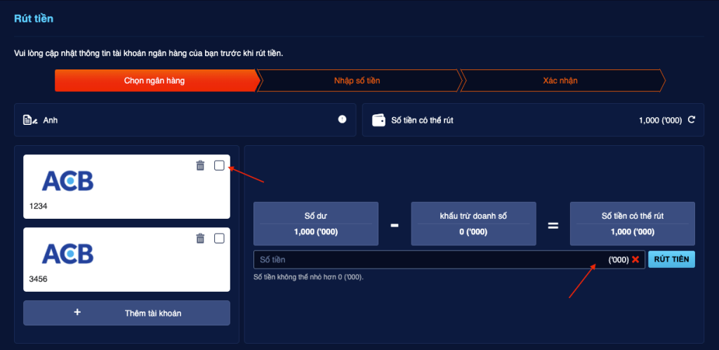 Bước 4: Chọn ngân hàng muốn rút tiền về và nhập số tiền muốn rút. Bấm “Rút Tiền”
