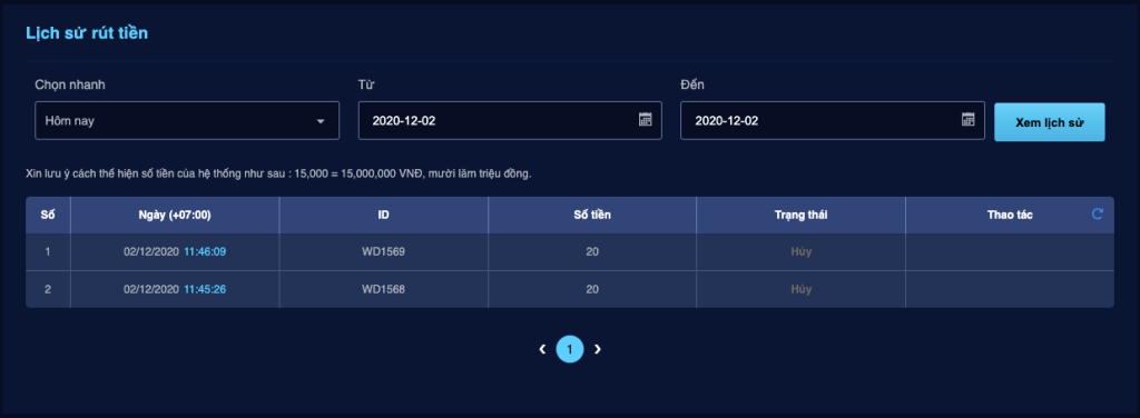 Bước 4: Kiểm tra trạng thái lệnh rút tiền tại “Lịch sử rút tiền”